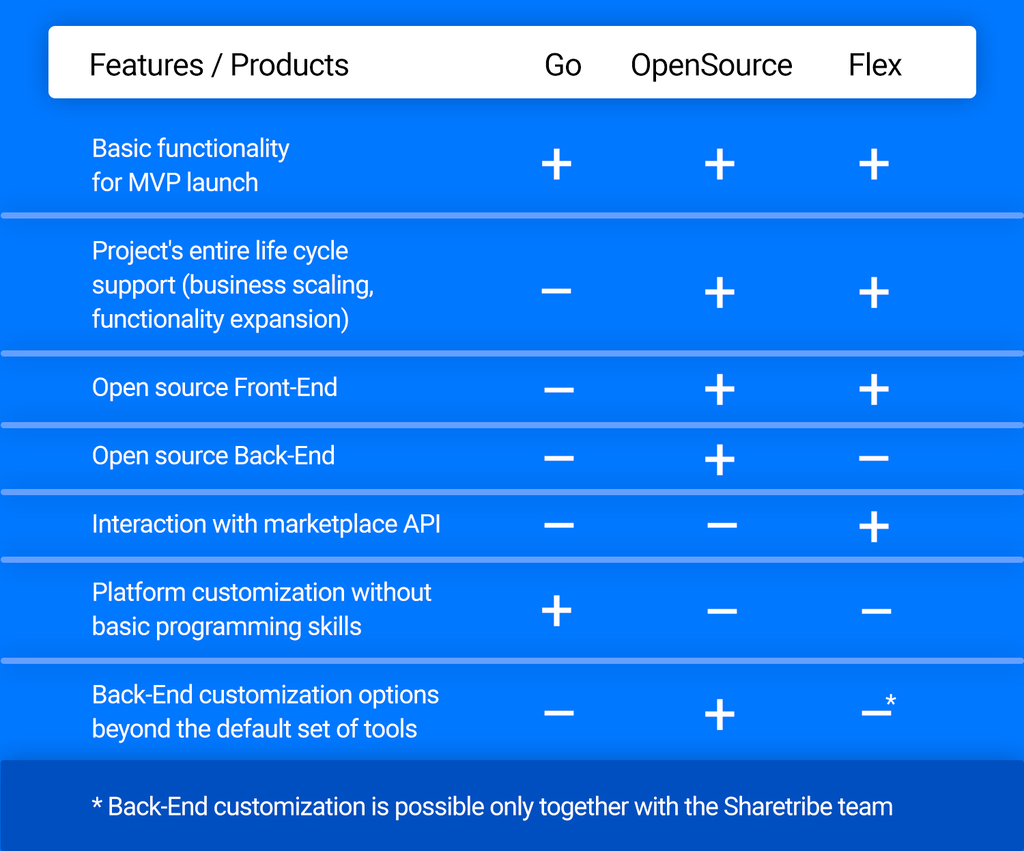 The table below gives an overview of the key differences between Sharetribe’s three versions: